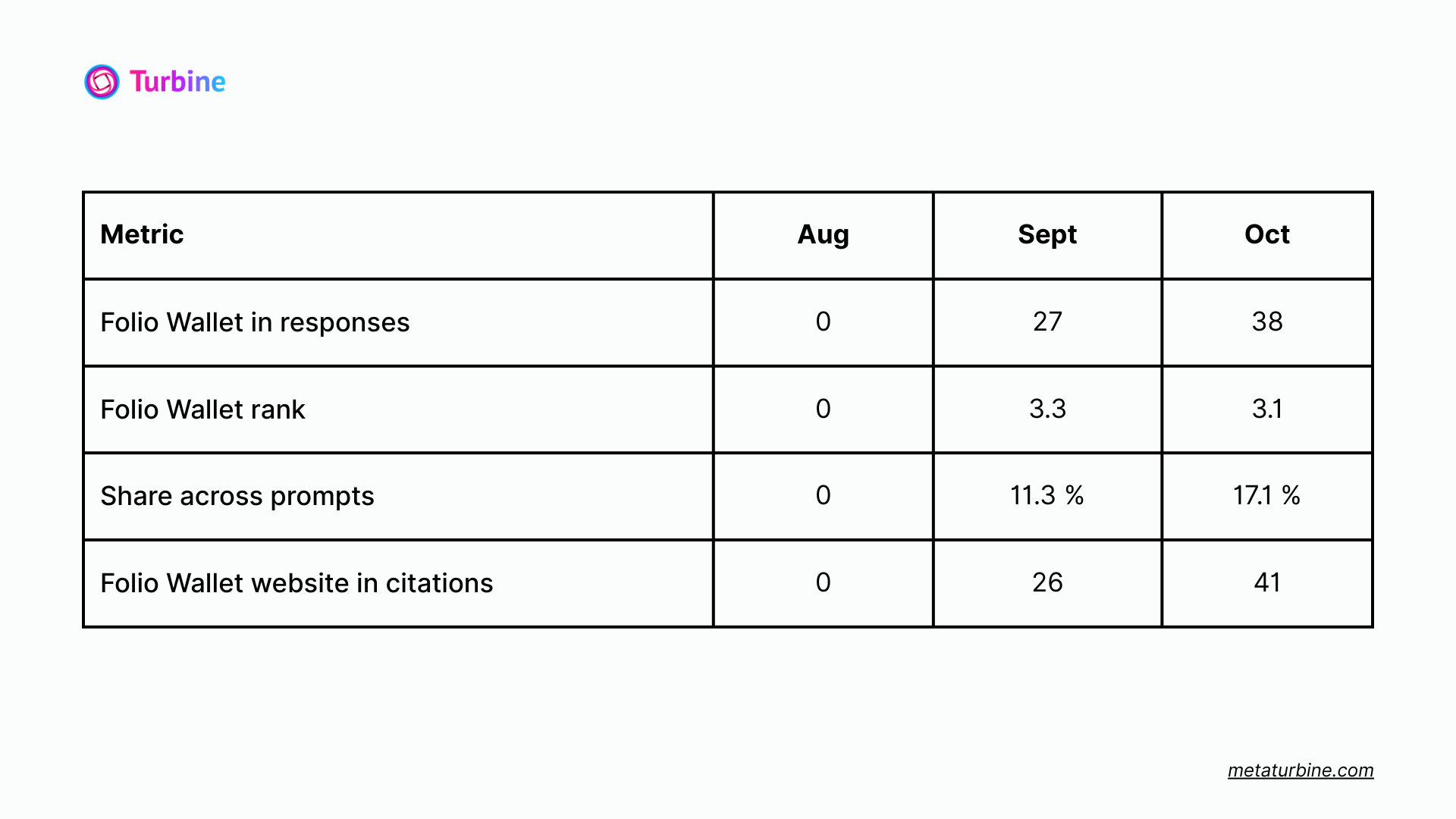 Within two months, Folio Wallet grew from zero visibility to appearing in AI responses with a 17.1 percent share across prompts and a 3.9 percent share across brands.